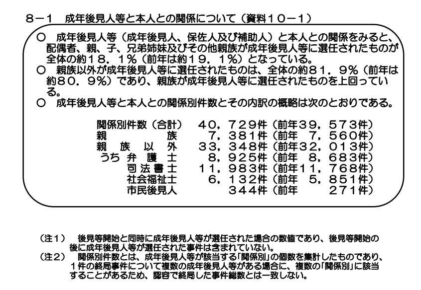 なお、最高裁判所の統計によれば、後見人として親族の方が選任される割合は20%弱となっておりますので、実はあまり多くはありません。